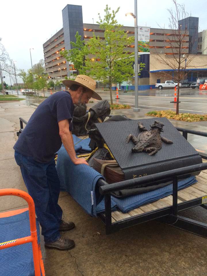 | Positioning Horny Toad Tome in the sculpture tent. |